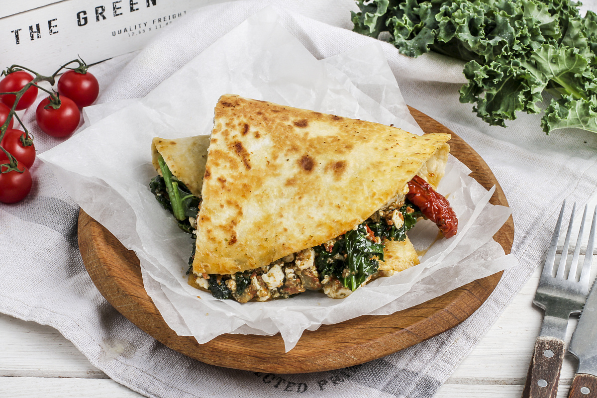 Подсушите тортильи на сухой сковороде по 1-2 минуты с каждой стороны до лёгкой румяности. На одну половину каждой тортильи выложить начинку, накрыв свободным краем.