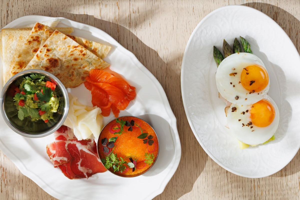 Холодная тарелка собирает деликатесы: икру сига с укропом, крем-чиз, гуакамоле, лосось гравлакс и набор сыров; к ней — лепешки и тосты, свежесть которых поддерживает баланс вкусов и текстур. Горячая часть — спаржа на гриле с пастрами из индейки и глазунь из двух яиц, поданная с хрустящей крошкой из хлеба — добавляет сытности и лёгкости одновремнно.
