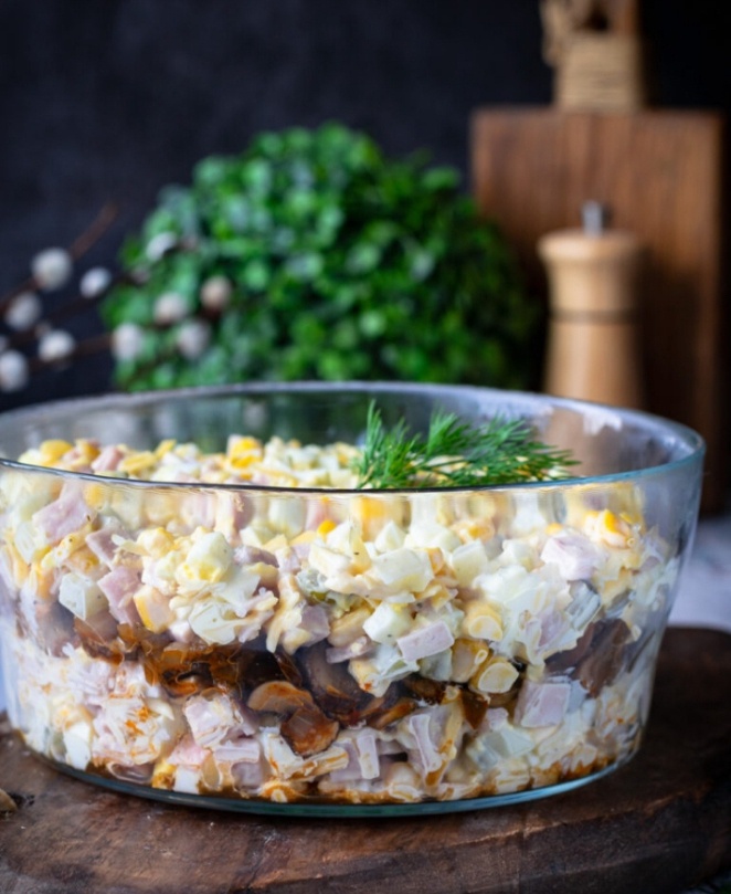 Поэтапно все ингредиенты соединяются, добавляется консервированная кукуруза, и в конце все заправляется заранее подготовленным соусом.