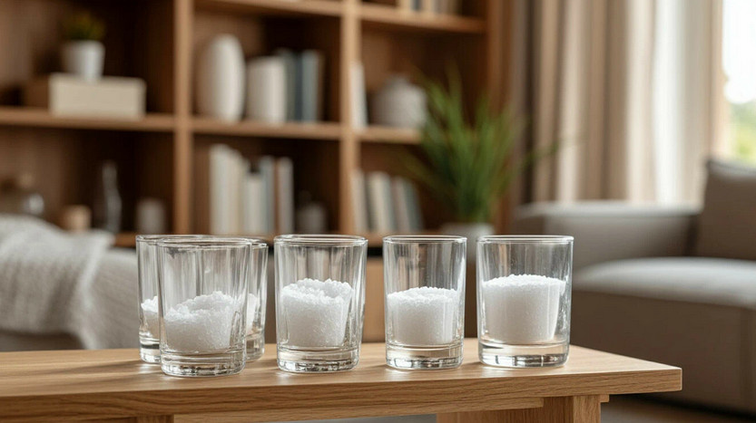 - Подготовка: Используйте прозрачные стаканы, чтобы наблюдать, как соль меняется со временем. На дно каждого стакана насыпьте примерно 2 пальца соли и добавьте щепотку риса — это поможет устранить запахи.