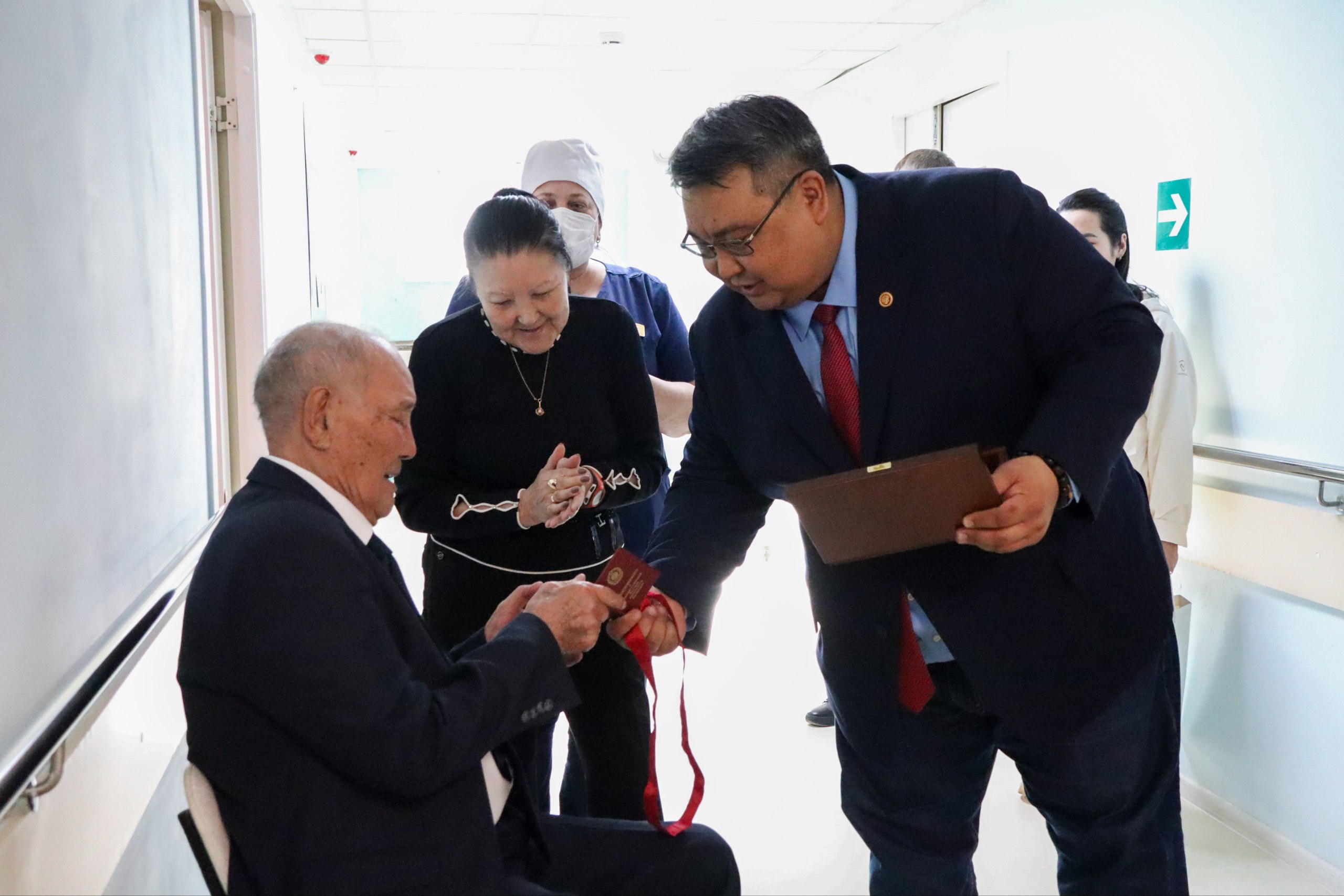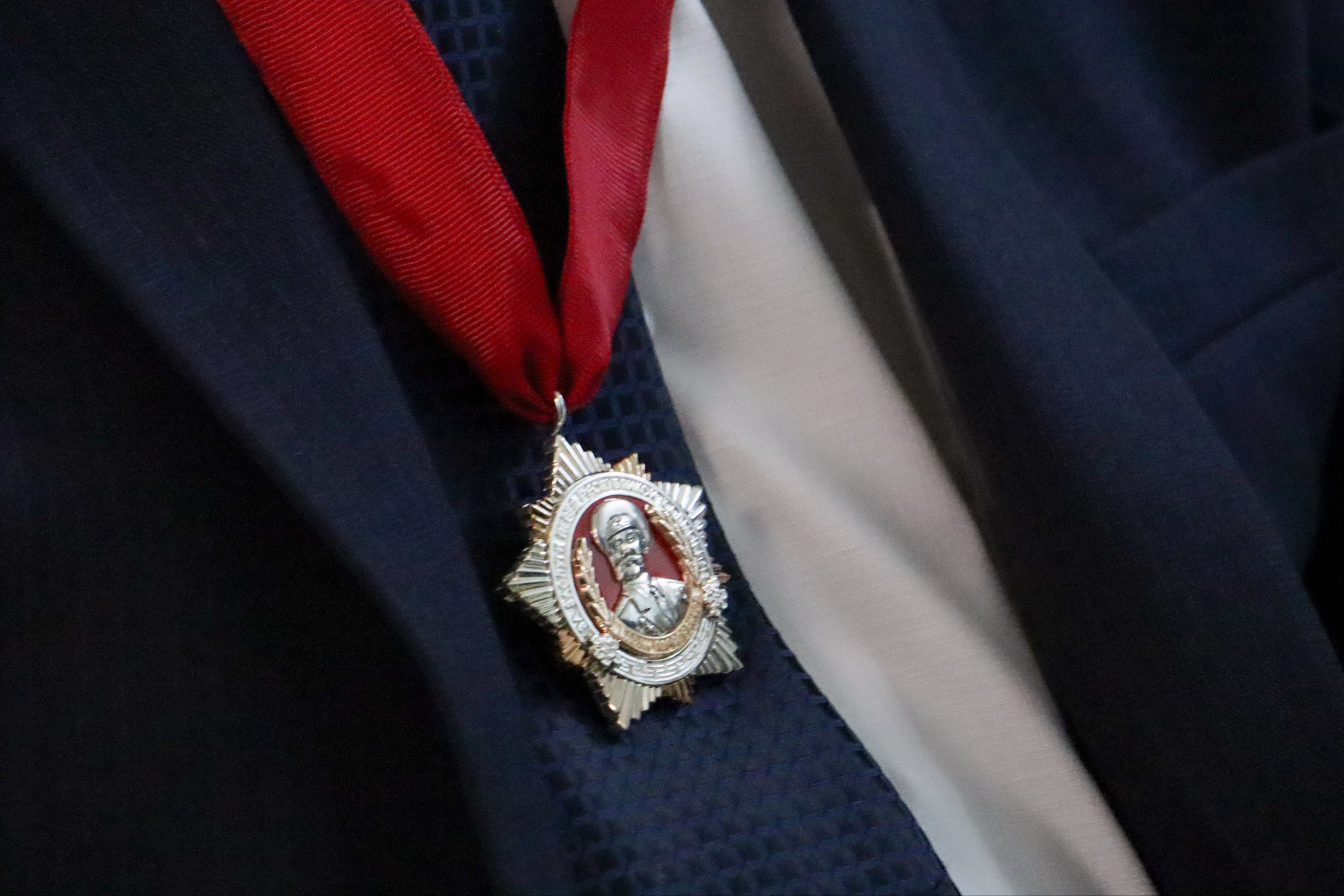 По поручению Главы Республики Калмыкия Бату Хасикова за выдающийся вклад в развитие физической культуры и спорта Савар Тарбаев наградил Александра Манджиевича орденом имени Басана Бадьминовича Городовикова.